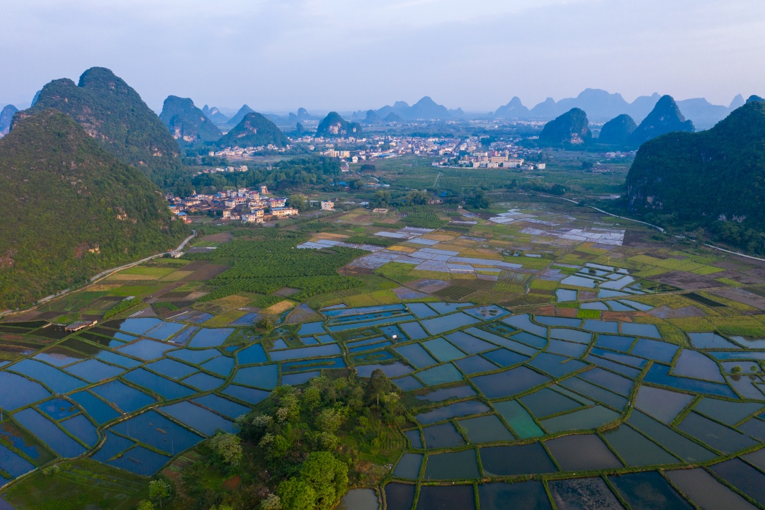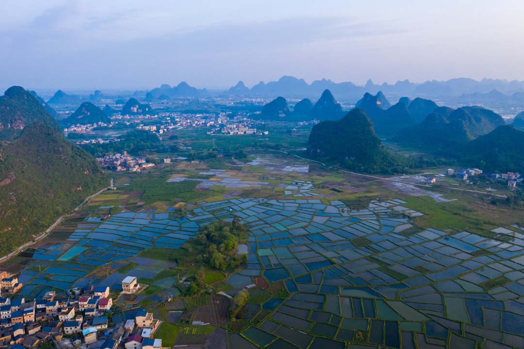 Morning: Begin with a pickup from your Guilin city hotel and a scenic drive to Huixian Wetland. Here, you’ll take a relaxing boat ride through winding karst waterways, spot elegant egrets hidden among the lush reed marshes, and climb Longshan Mountain for breathtaking panoramic views of the landscape.