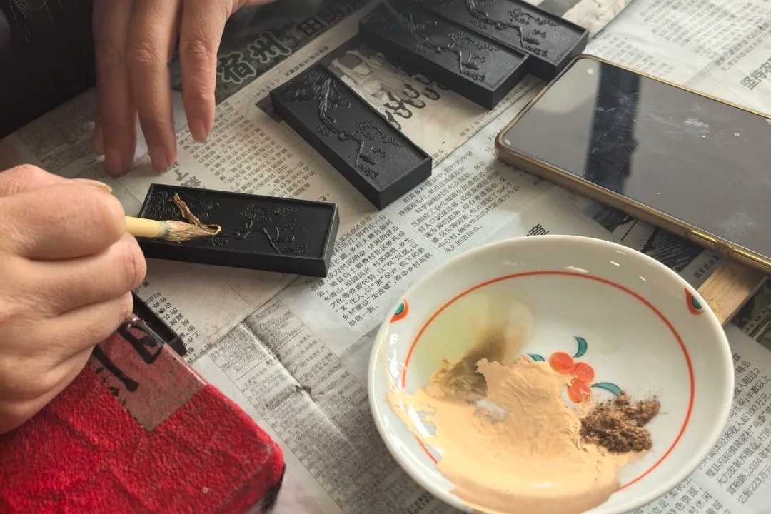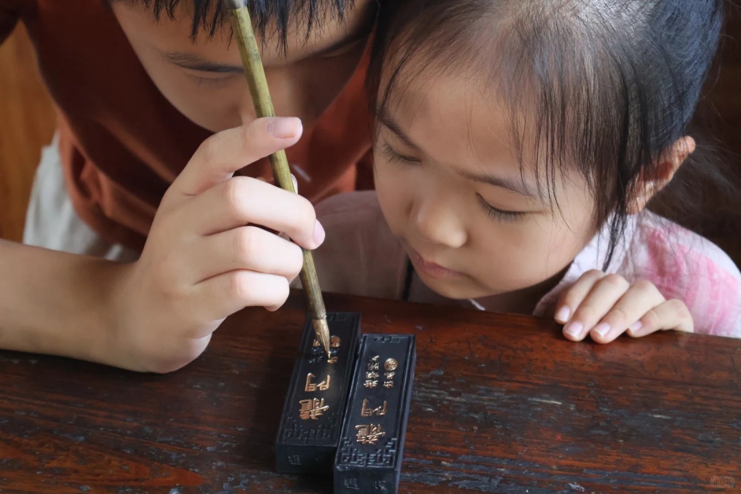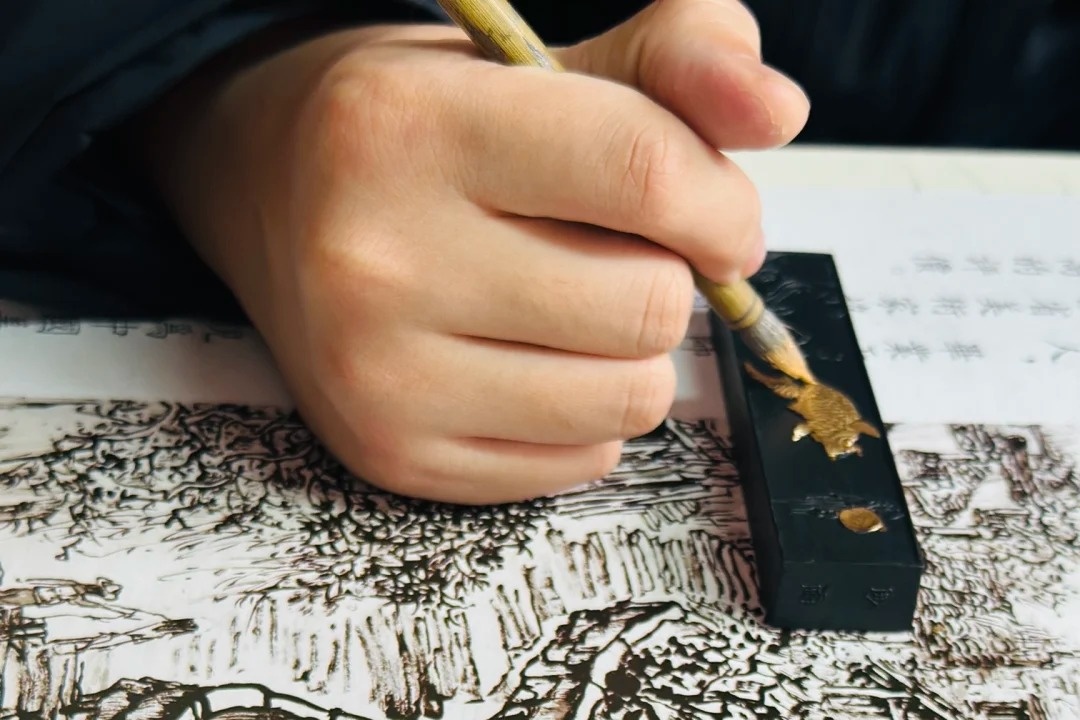 Using an extremely fine brush, you will delicately trace designs in gold powder or gold leaf onto the smooth, dark surface of a pressed ink stick. You can choose traditional motifs - a dragon, a plum blossom, or an auspicious character - to bring to life. Each stroke requires a steady hand and deep concentration, revealing a brilliant pattern against the black backdrop.